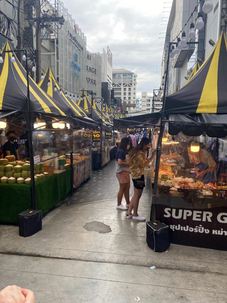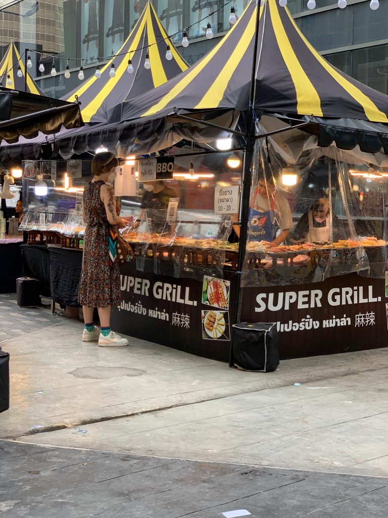 Somit hatten wir also unseren Soll erfüllt und sind nochmal ins Zentrum gefahren um etwas durch das Siam Square One zu schlendern. Ab 16:00 Uhr hatte direkt neben dem Center ein kleiner Markt aufgemacht. Dort gab es im ersten Teil leckeres Streetfood und auch Getränke und im zweiten Teil Kleidung. Wir haben dann endlich mal leckere Spieße ausprobiert – die waren sooooo lecker!