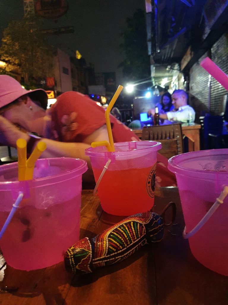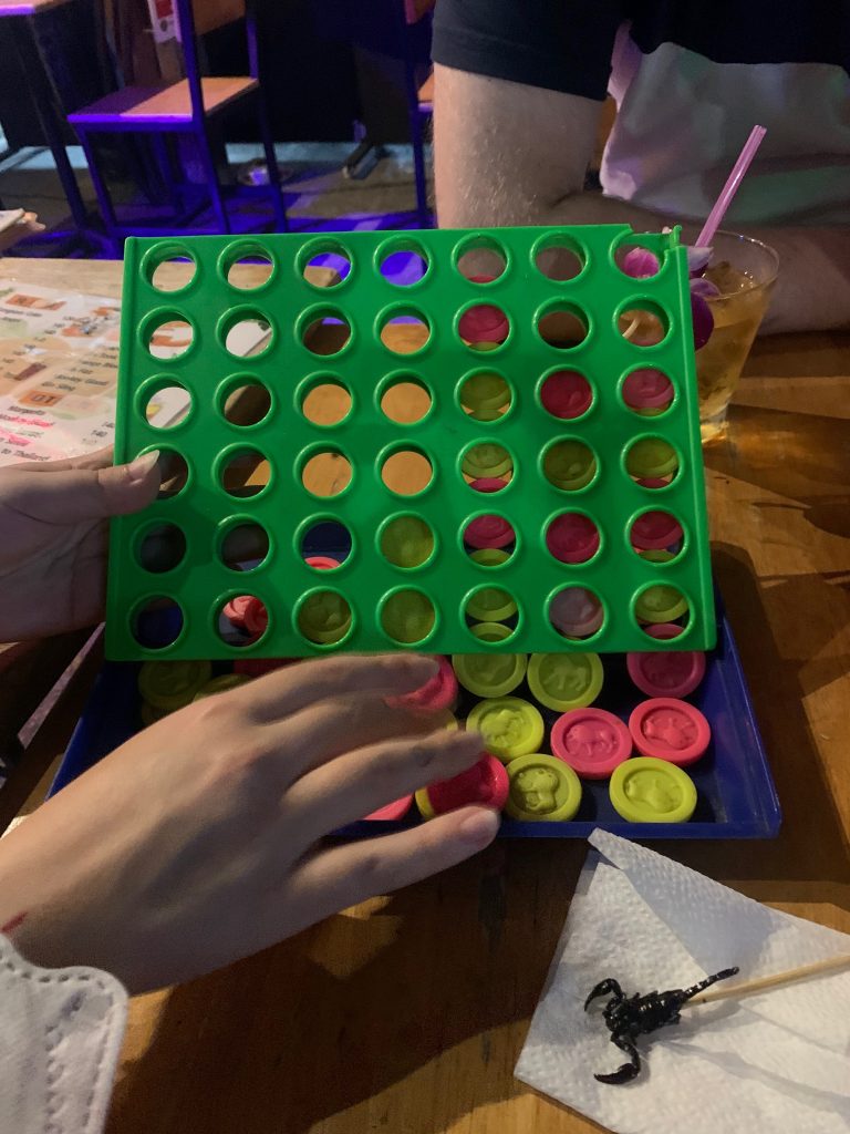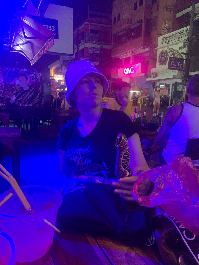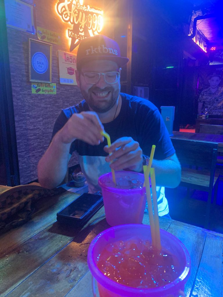 In der Straße war relativ wenig los, was uns nicht wunderte, da der Tourismus erst wieder begann in Thailand. Daher war es ebenso wenig überraschend, dass wir “begehrte Ware“ waren und überall versucht wurde uns in die wenigen Bars zu lotsen. Entschlossen verschiedene Bars auszuprobieren, setzten wir uns also in eine und tranken leckere Cocktails. Lustigerweise bekamen wir auch ein Gesellschaftsspiel – voll die gute Idee!