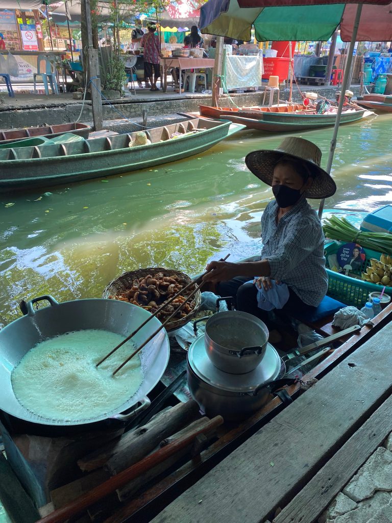 Auf dem Markt haben wir auch eine Dame getroffen, die vom Boot aus frittierte Bannen verkaufte und auch dort durften wir probieren. Piyaporn erzählte uns, dass diese Dame für ihre leckeren Bananen berühmt sei und so lecker wie die waren, konnten wir das auch verstehen!