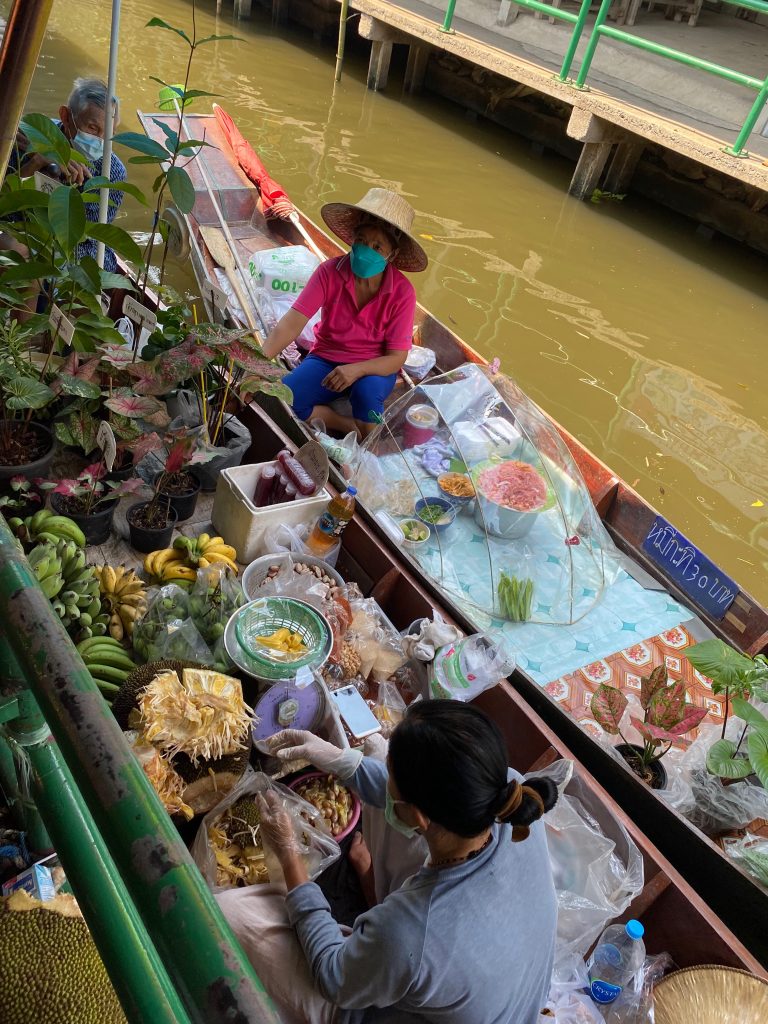 Wir haben uns unsere Laune aber nicht vermiesen lassen, dafür war immerhin auch keine Zeit. Piyaporn hat uns etwas durch die Stände geführt, ehe sie mit uns die Flussseite gewechselt hat, wo auch schon ein Boot auf uns gewartet hat. Auch dort waren wieder alle super nett und halfen uns beim Einsteigen. Gemeinsam haben wir dann eine Fahrt durch die Klongs (Kanäle) gemacht und wieder einige Informationen bekommen – z. B., dass die Postverteilung in diesem Bereich auch über Boote durchgeführt wird, weswegen überall Briefkästen an der Flussseite zu sehen waren. Es war wirklich alles sehr spannend und die Bootstour hat so viel Spaß gemacht!
