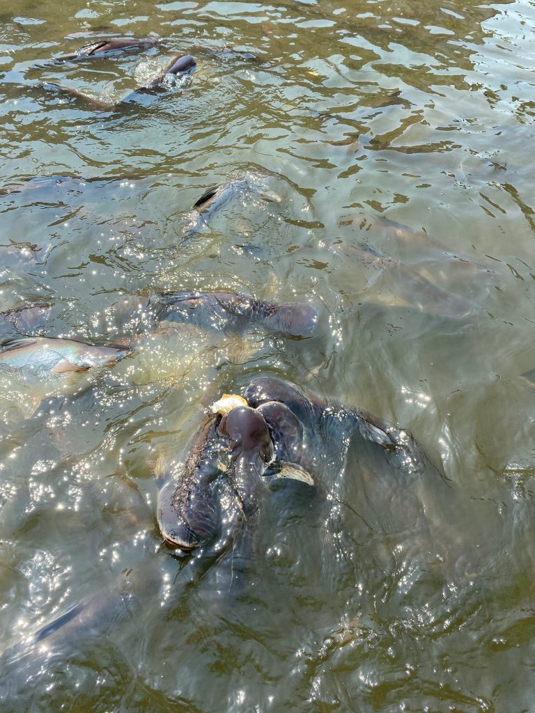 Wir gingen wieder zurück zum Boot und plötzlich kaufte Piyaporn einen großen Packen Weißbrot. Wir dachten uns nichts dabei, bis sie uns dann etwas in die Hand gab und selbst ein Stück ins Wasser warf. Und das war eine Überraschung! Ein fischiges Gewimmel war im Fluss zu sehen. Unmengen von Fischen, die nach dem Brot schnappten. Uns wurde erzählt, dass es auch verboten sei dort zu angeln, da diese Fische wohl etwas Besonderes seien dort am Tempel. Es hat wirklich Spaß gemacht den vielen Fischen zuzusehen. Und plötzlich war es ein ganz anderes Gefühl mit dem Boot weiter zu fahren, denn wir wussten ja nun zum Teil, was dort in dem Wasser lauerte. 😉 Es waren aber nicht die einzigen Freunde, die wir trafen. Auch Warane schwammen neben uns im Fluss. Die hatten wir zum ersten Mal gesehen.
